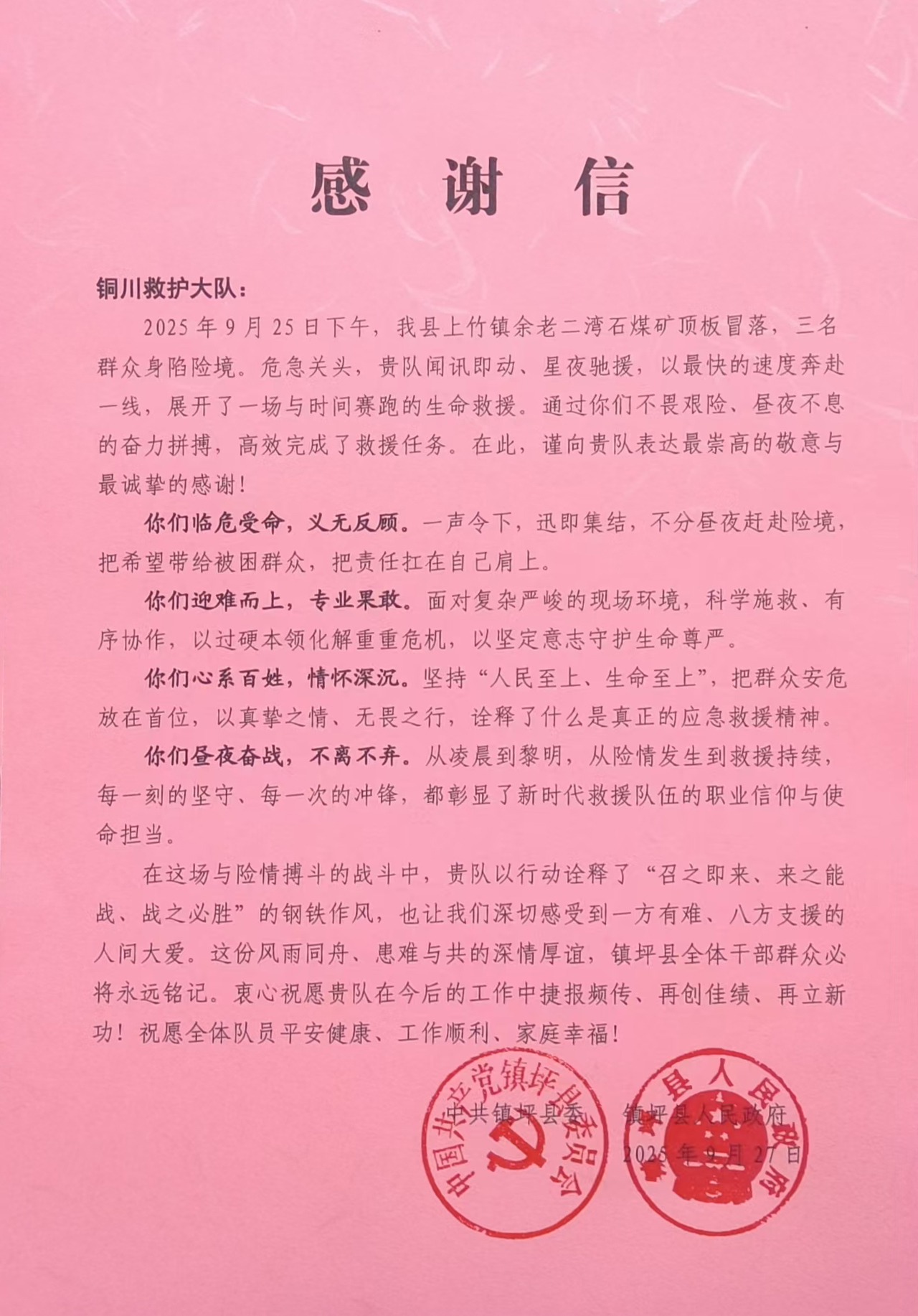 “在人民群眾生命財(cái)產(chǎn)安全受到威脅的危急時(shí)刻,銅川隊(duì)響應(yīng)迅速、行動(dòng)果敢、技術(shù)過(guò)硬、作風(fēng)頑強(qiáng),充分體現(xiàn)了專業(yè)救援隊(duì)伍的高度責(zé)任感和使命擔(dān)當(dāng),讓我們深切感受到一方有難、八方支援的人間大愛(ài)!”鎮(zhèn)坪縣委、縣人民政府在感謝信中表達(dá)了誠(chéng)摯的敬意。