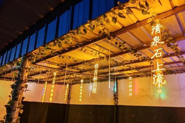 當(dāng)夜幕降臨,煤臺的休息區(qū)仿佛被注入了魔力。暖黃色的燈光,透過翠綠藤蔓的間隙,灑下一片片斑駁的光影。王維筆下的詩句“明月松間照,清泉石上流”,化作靈動的燈飾,在微風(fēng)中輕輕搖曳。藤蔓如綠色的瀑布般垂下,光影與綠意交織,營造出一種寧靜而雅致的氛圍,讓職工感受到了一絲別樣的詩意。