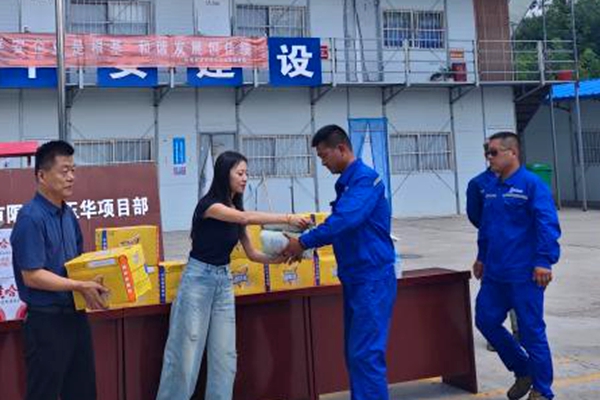 在各個施工點(diǎn),工人們頂著高溫緊張作業(yè),汗水早已浸透了工裝。慰問組一行帶著冰紅茶、蘇打水、茶葉等防暑物資來到現(xiàn)場,逐一送到工人手中,并與他們親切交談,詳細(xì)詢問施工進(jìn)度、高溫作業(yè)時段安排及防暑措施落實(shí)情況。